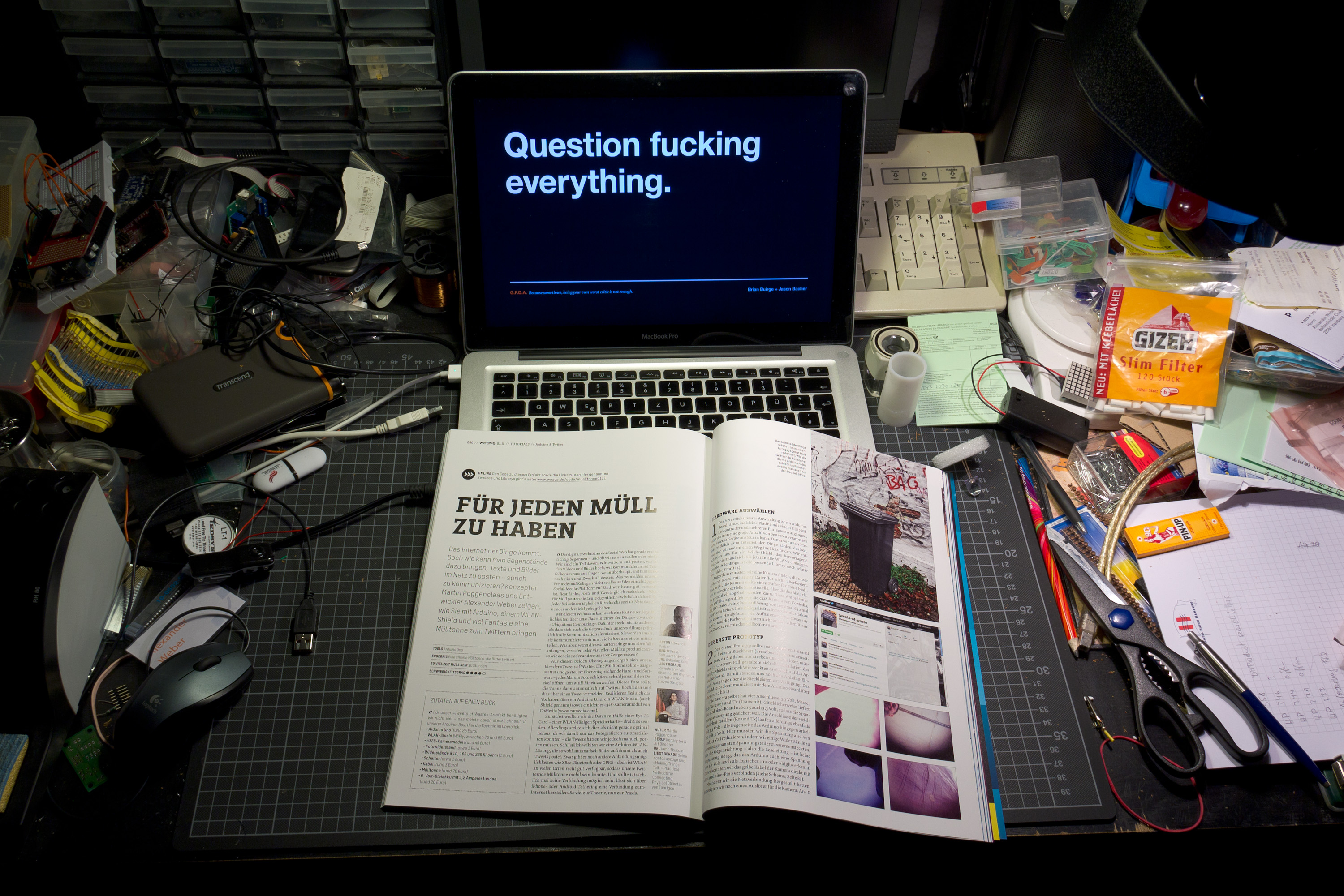 What you see there on my desk is the current issue (2011/01) of Weave. Weave is a magazine that covers interactive design and such. We were asked to write an article on “internet of things” and now, there it is. It’s a tutorial on how to use Arduino with twitter and how to take pictures and upload them.