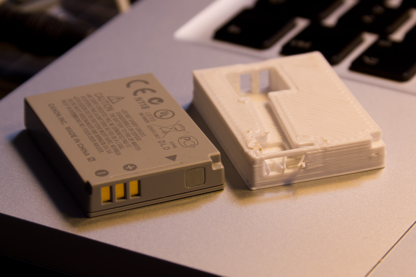 This is how it came out of the printer, next to the original battery. Actually this is the second one. The first was a bit too thick to fit into the battery compartment. The weird looking plastic stripes at the slot at the front result from a messed up support structure. A bit of cleaning had to be applied.