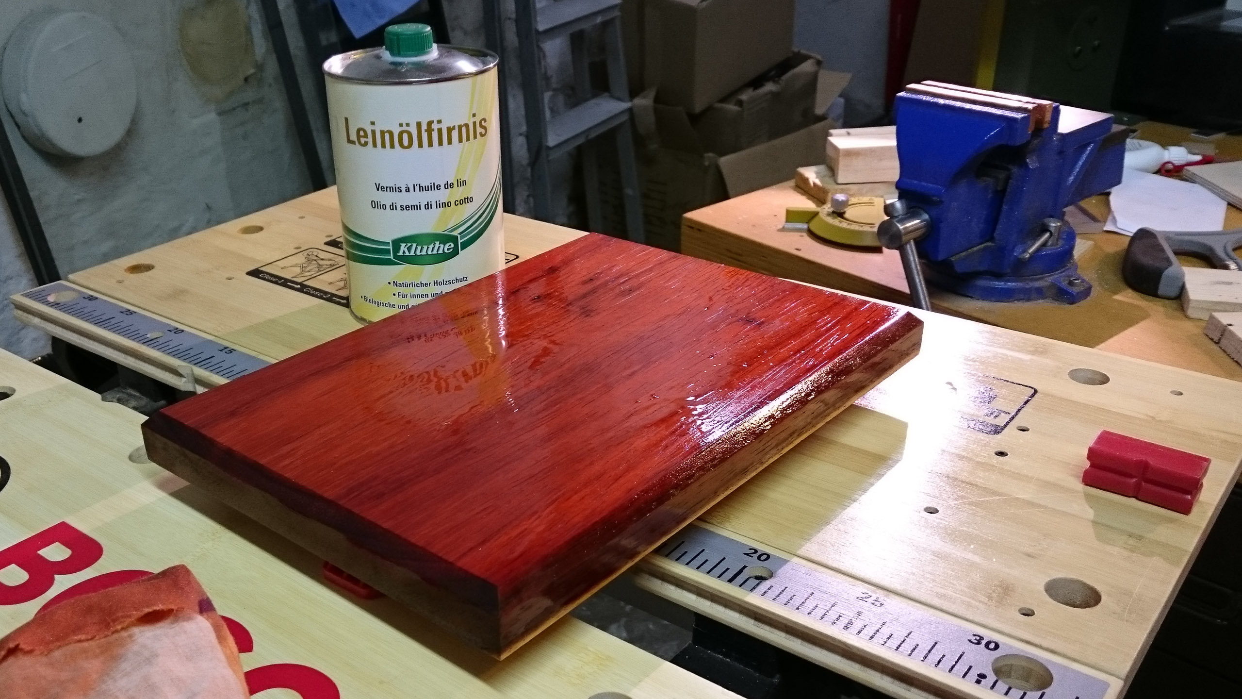 Of course, such a marble machine needs a nice base. To find a nice piece of wood I spent a couple of hours at a wood shop for local and exotic woods. I bought a piece of african padouk. That piece then got cut to length, sanded (a lot!) and finished with linseed oil.