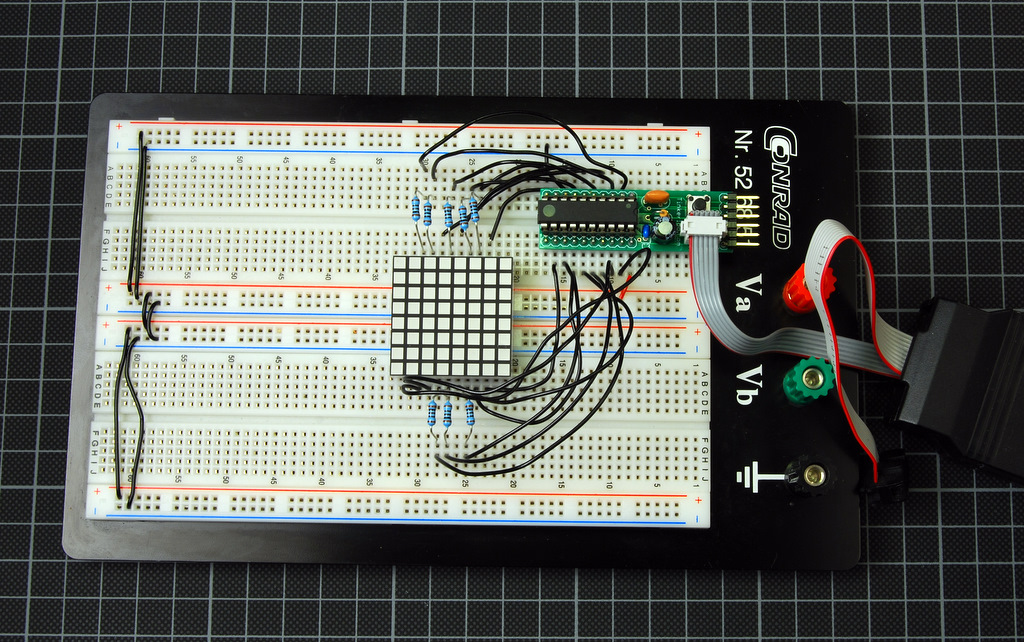 And as you see, there are no resistors. Normally you would need a resisor to limit the current through the LEDs. We are a bit adventurous here and attach the LED matrix the Evil-Mad-Scientist-way directly to the controller. The controller enables only one row at a time and cycles thru all rows that fast, that a steady image emerges.