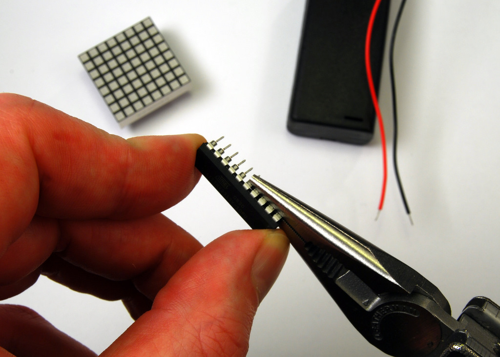 Fix the the controller in place with alligator clips. Place it on the matrix so that there are two pins on the top and on the bottom, that are not attached to the matrix. This can be a bit tricky. Maybe you have to realign some of the pins. There is a small notch on the microcontroller. That notch has to point to the left.