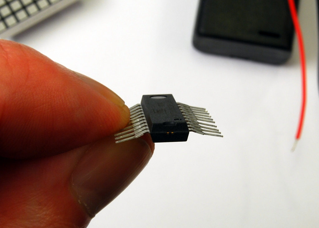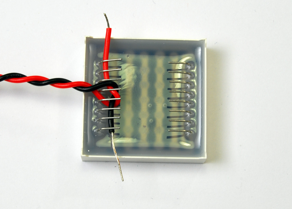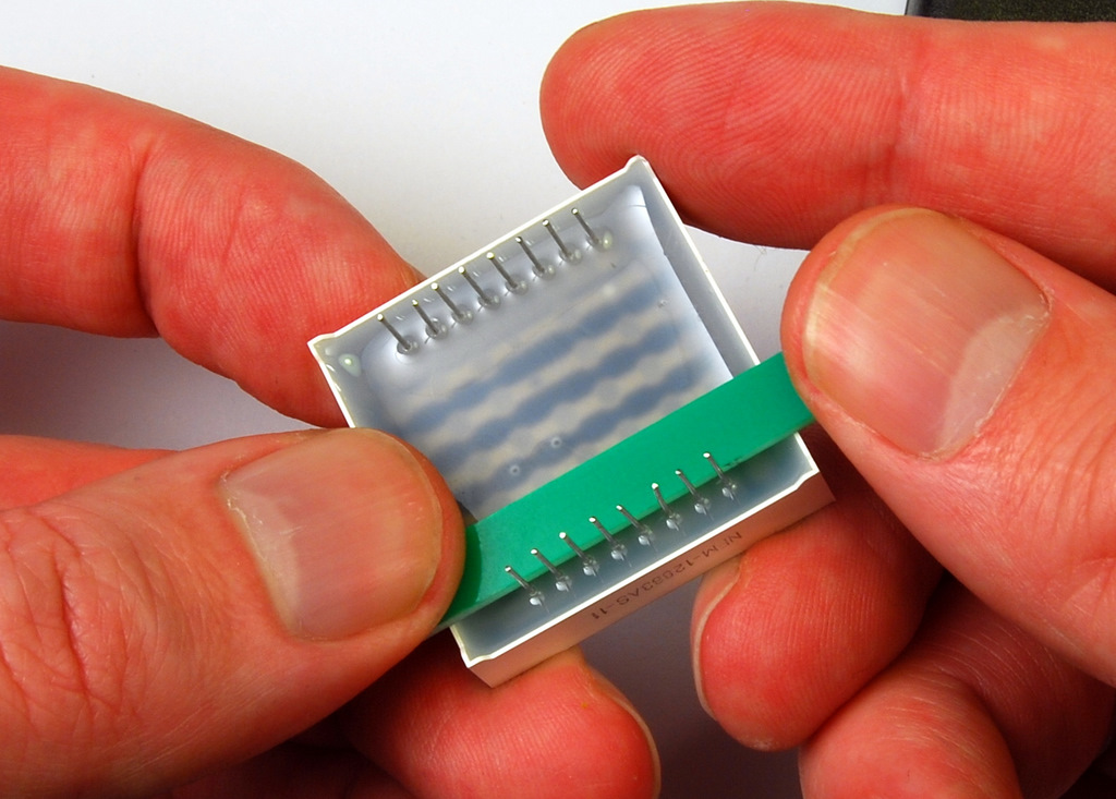 Now we have to bend the matrix pins. Use a small flat piece to bend the pins over it. I used a piece of a PCB. Note the inscription at the bottom of the matrix.