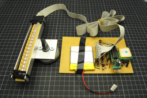 A bit tricky was to have the message not stretched or compressed at different speeds. To be able to draw the characters correctly, I used the GPS. The GPS is read constantly in the main loop. Every $GPVTG sentence is parsed to determine the current speed. With that value I can now set the OCR2A register to make the timer interrupt trigger slower or faster, which makes the LEDs light up for a longer or a shorter time.