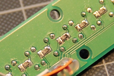 LEDs are the same as before, current limiting resistors are SMT 1206 22R. The picture still show 47R resistors. That’s because I failed. I replaced the LED driver without checking the remaining voltage at the LEDs. Surprisingly the ULN2803 had a higher voltage drop as my transistor solution. That made the LEDs dimmer. So I had to replace all SMT resistors.
