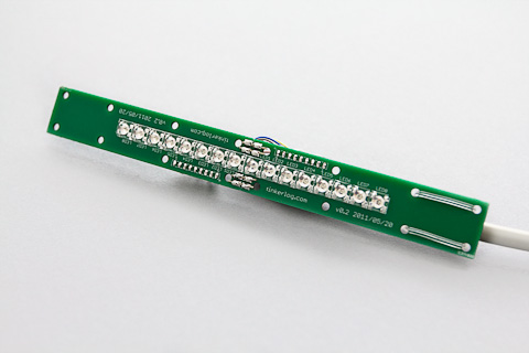 The LED strip is pretty much straight forward, except that I needed a PCB of about 180 to 200 mm length. The problem is, that Eagle CAD in the smallest edition allows only boards of 100×80 mm. I tried other tools on OSX for about 2 hours but wasn’t that successful. So I switched back to Eagle and designed only half of the board with 8 LEDs on it. Then, if you take two and rotate one by 180 degrees, you could solder them together to form one larger piece. The DSUB-25 cable has 9 connections to each board (8 + VCC), so there are no other connections between the two PCBs. The solution is not pretty but it worked out and I was in a hurry.