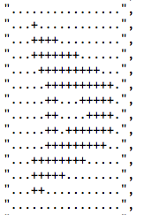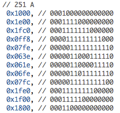The Arduino sketch to switch the LEDs on and off is also not that complicated. I setup timer 2 to fire an interrupt (TIMER2_COMPA_vect). Every time the timer fires, it fetches the according line of the current character and dumps it out on all 16 pins. When the last character is reached, it starts over from the beginning of the message.
