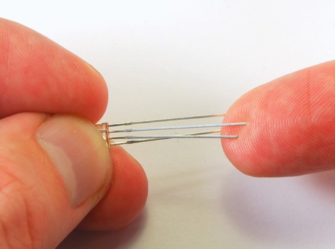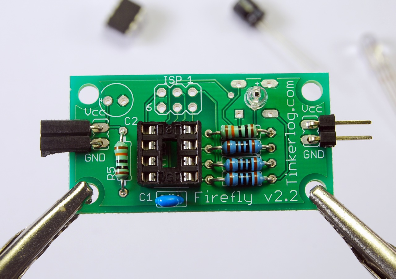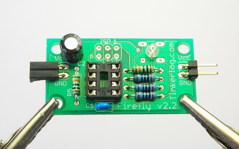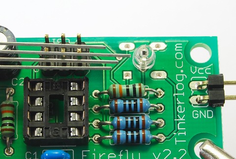 Insert the ATtiny13V controller. You may have to bend the legs slightly to fit into the socket. Place the controller with one side on a flat surface and bend it slightly. Now turn it around and bend the other 4 legs.
