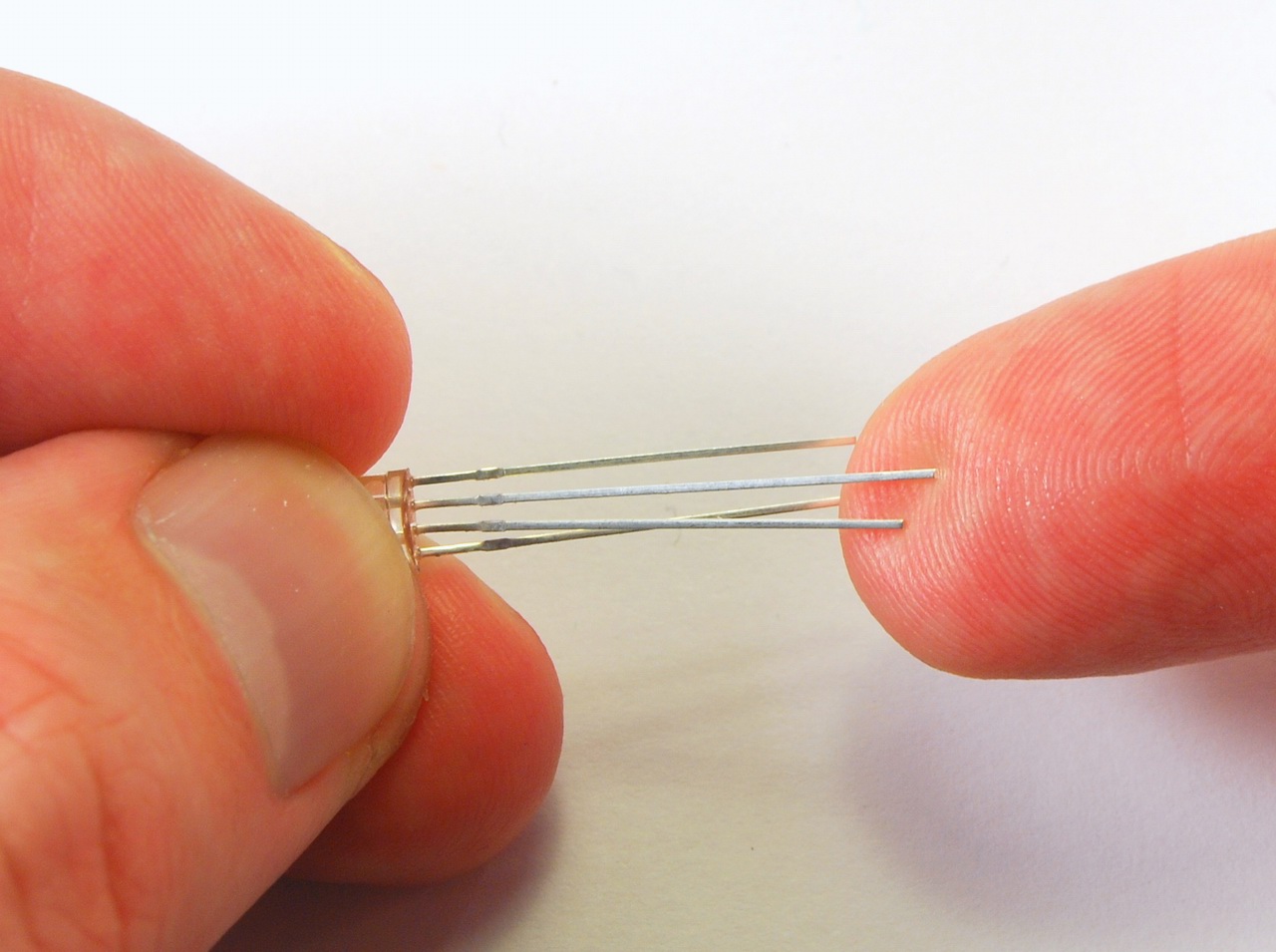 Inserting the RGB LED is a bit tricky. The pins are numbered (in the photo from bottom to top):