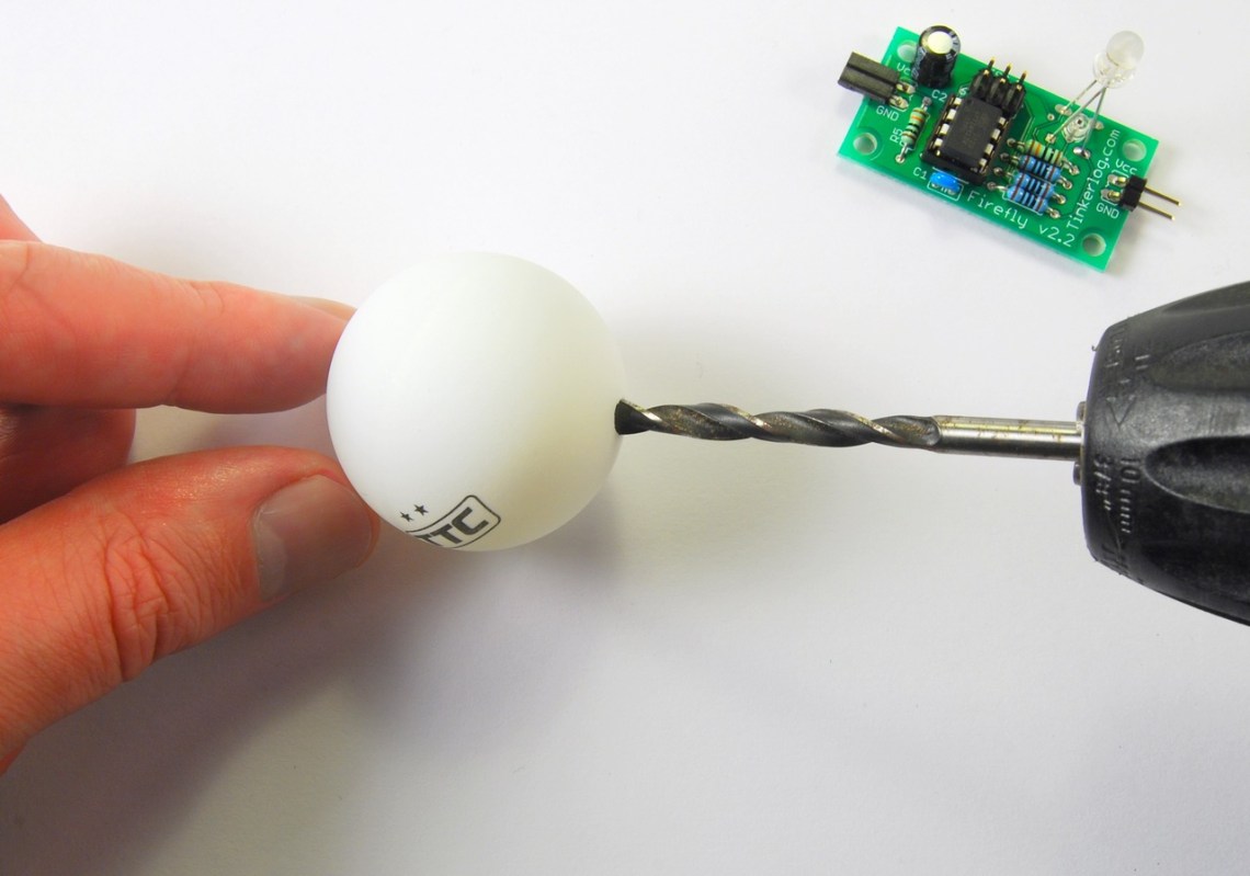 Drill a 4mm hole into the ping pong ball. Use a file to widen the hole a bit until it fits on the LED. Don’t use a 5mm drill or the ball will not stick on the LED.