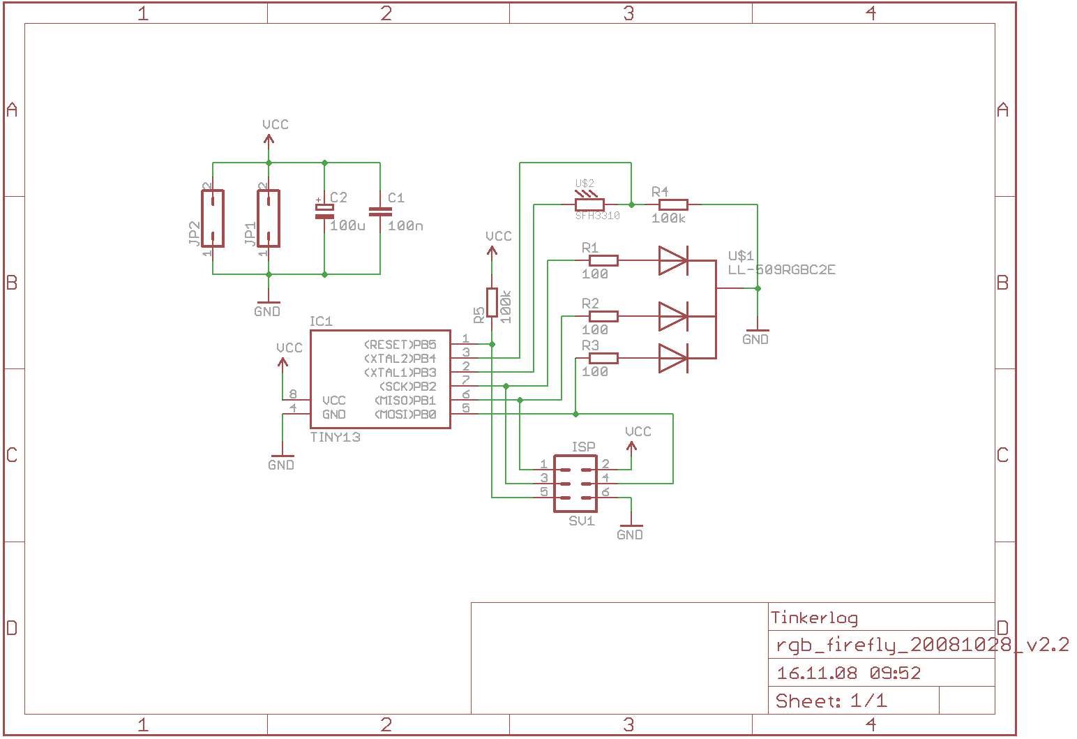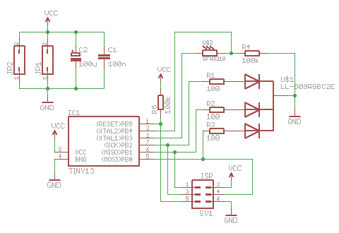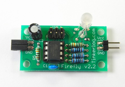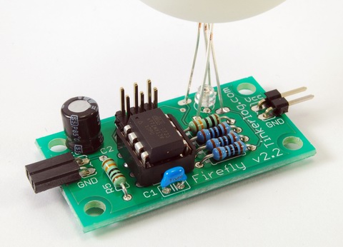 This circuit simulates a firefly with a tiny microcontroller. If put together with other fireflies, they will flash randomly. But after some time they will start to interact with each other and the flashes will start synchronize until all fireflies flash at once.