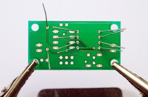 Bend the legs a bit, so that they don’t fall off, if you flip the PCB. Solder them.