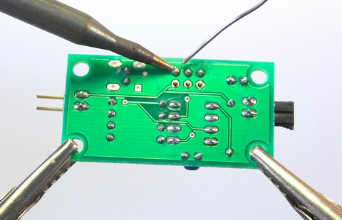 Take care when you insert the phototransistor. The short leg (collector) has to be inserted in the upper (+) hole. Now solder it.