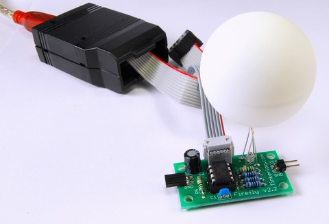 A phototransistor is used as input sensor to detect changes in the lighting. A powerful RGB LED is used for the flash. Every firefly has a given frequency for its flashes. If it sees that its neighbour flashes a bit earlier, it tries to flash a bit earlier as well. Doing so over and over again may lead to all fireflies flashing in sync.