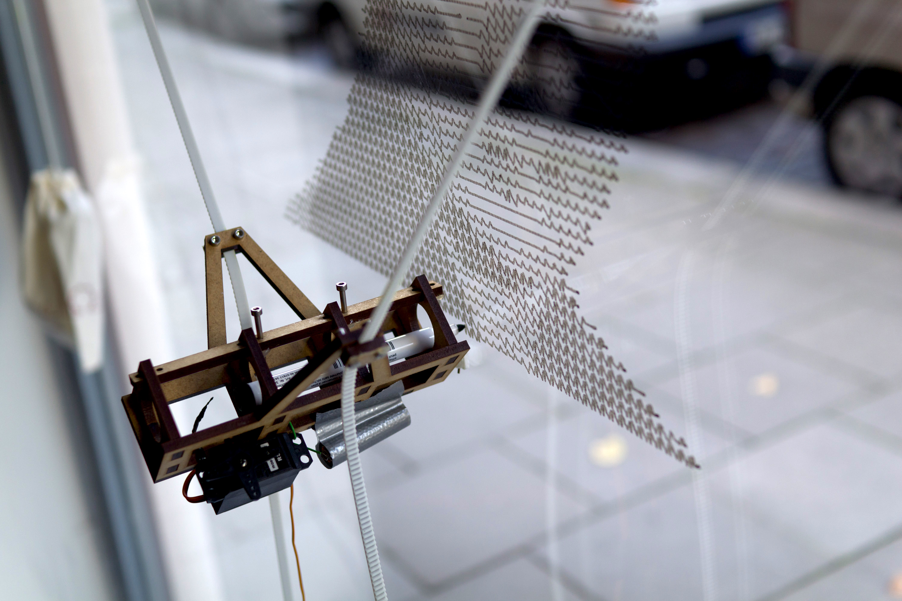 In May I moved into a new office with the great guys of The Future of Everything. The office has really nice big windows and we thought about what we could do with them. I remembered hektor, this super cool 2D drawing machine. What if that thing could draw directly onto the window?